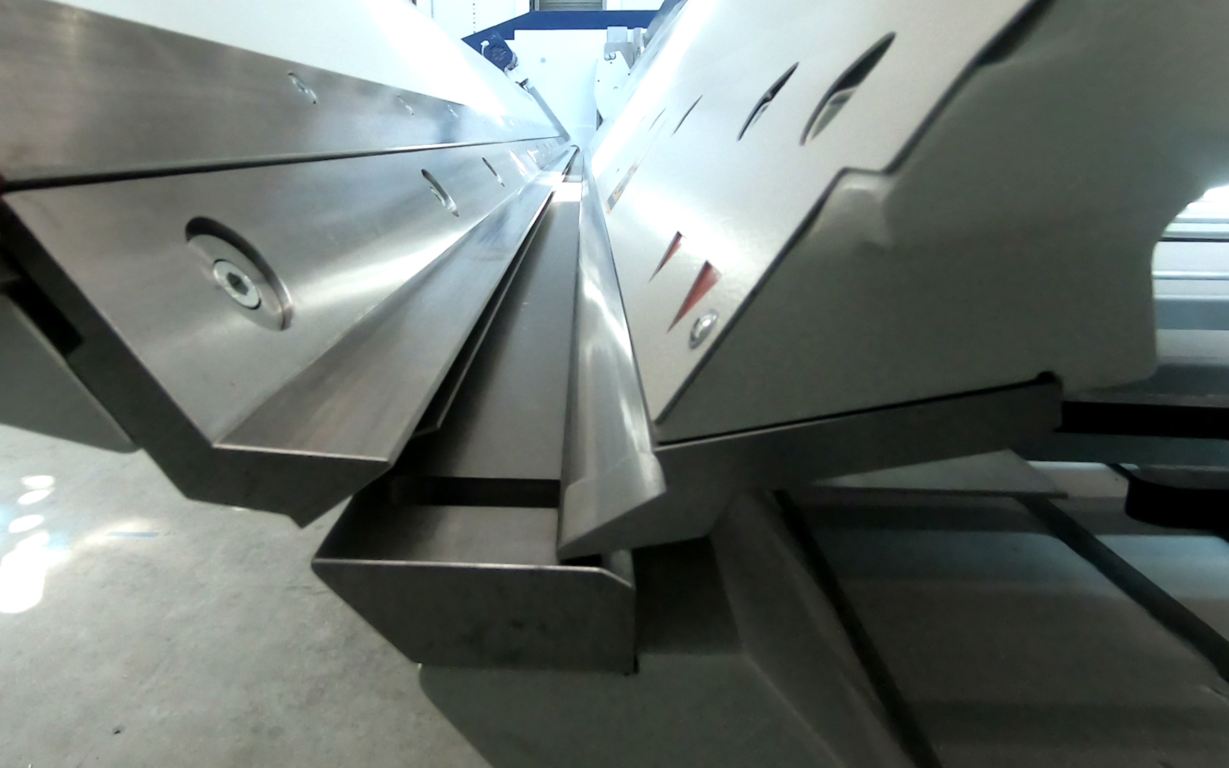 Dünnbleche bis 2,5 mm Stärke kantet die PowerBend Multi (PBM) ab. An ihr zeigt Schröder eine weitere Innovation. Die Maschine verfügt über eine drehbare Oberwange, mit der man zu einer anderen Geometrie beziehungsweise Werkzeugstation wechseln kann. Diese Oberwange ermöglicht aber auch ein patentiertes Verfahren für Hohlumschläge. Dabei wird sie zurückgesetzt und das Blech so geklemmt, dass die Biegewange über die Senkrechte hinaus Platz hat. Auf diese Weise lassen sich Hohlumschläge in nur einem Arbeitsgang biegen und zudrücken – präzise und zeitsparend. Das auf der Messe gezeigte Modell demonstriert dies an einem 2 mm starken Stahlblech auf 3200 mm Länge.